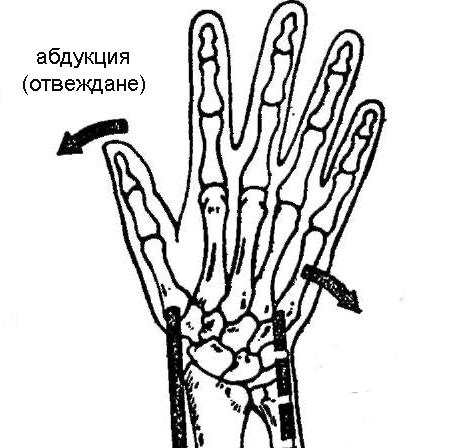 отвеждане, отдалечаване от средната линия на тялото (ако се касае за цял крайник)