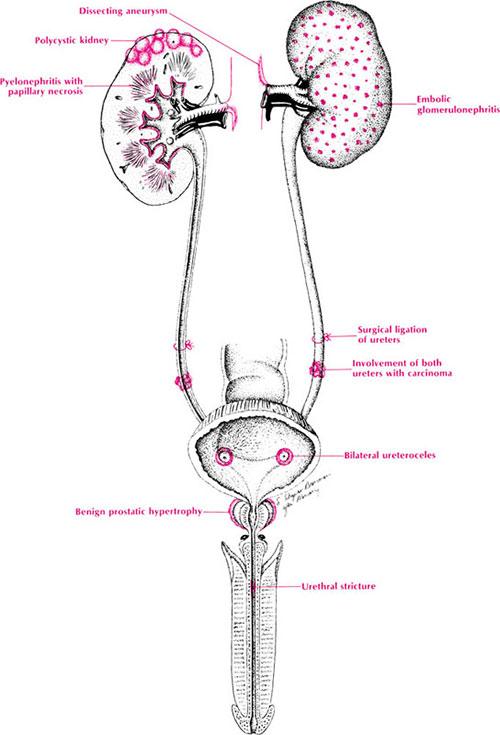 с анурия се означава отделянето на по-малко от 100 мл урина за денонощие; поради задръжката на течности в организма се стига до покачване на телесното тегло и образуване на отоци по крайниците и лицето; ако отделянето на урина не се възобнови се стига до остра или хрронична бъбречна недостатъчност с прояви на уремия;