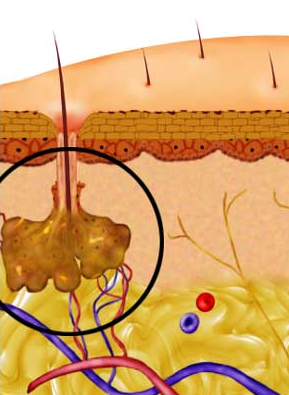 киста на мастна жлеза; възниква при запушване на изходния й канал; кистата е изпълнена с материал, наречен себум; себум се произвежда от мастните жлези на епидермиса; има големина от 3-4 mm до 3-4 сm