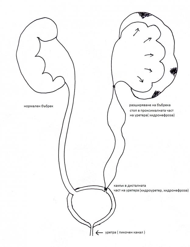 Хидронефрозата се характеризира с разширяване на легенчетата и чашките на бъбрека поради смутен отток на урината. След време бъбречната тъкан атрофира от натиска и намалява отделянето на урина. Препятствието за оттичането на урината може да лежи в легенчето, в чашките, в уретера или в мехура. Хидронефрозата може да е вродено заболяване. Тогава причината трябва да се търси при едностранна хидронефроза в съответния уретер ( виж фигурата ), а при двустранна - в уретрата. Освен механичните препятствия пречки за оттичането на урината могат да бъдат и някои заболявания на мускулния и нервния апарат на уретера, уретрата или легенчето. По-често се засяга десният бъбрек. Заболяването се среща еднакво често и в двата пола. Болестта се явява най-често между 20-и 40-годишна възраст, но се среща (макар и рядко) и при деца. В началото разширеното легенче съдържа урина, но по-късно нейните съставни части силно намаляват. Вследствие натиска на задържаната урина бъбрекът атрофира и се превръща образно казано в торба. Ако препятствието е в уретера, той също се разширява над нивото на препятствието. Хидронефрозата се изявява клинично с тежест и "тъпи" болки в кръста, които могат да се проявят на пристъпи, смущения в уринирането, понякога кървава урина, по-късно при пионефроза - температура, отпадналост и други симптоми на инфекция. При вродената хидронефроза може да няма никакви оплаквания. В някои случаи препятствието в оттичането на урина може временно да отпадне и оттокът на урината да се възстанови. Тогава болният изкарва голямо количество урина и болките стихват. Лечението на хидронефрозата е консервативно или оперативно според причината за обструкцията. Важно е при доказана ехографски хидронефроза лечението да се провежда своевременно от специалист уролог или нефролог, за да не развие пионефроза.