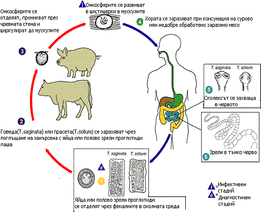 Цестодите (лентовидни червеи) Taenia saginata (говежда тения) и T. solium (свинска тения) причиняват цистицеркоза при хората чрез ларвните си форми, съответно Cysticercus bovis и Cysticercus cellulosae. Хората са единствените крайни гостоприемници на Taenia saginata и Taenia solium. Яйцата от полово зрелите проглотиди преминават и се отделят с фекалиите ; яйцата могата да оцелеят във външната среда от няколко дни до месеци. Говедата (T. saginata) и прасетата (T. solium) се заразяват чрез поглъщане на контаминирана с яйца или полово зрели проглотиди паша . В тънките черва на животните онкосферите се развиват , проникват през чревната стена и мигрират до напречно-набраздената мускулатура, където се развиват в цистицерки. Цистицерките могат да се запазят в животните до няколко години. Хората се заразяват чрез поглъщане на сурово или недобре приготвено заразено месо. В тънките черва на човека цистицерките се развиват над 2 месеца в зрели червеи, които могат да оцелеят до няколко години. Зрелите лентовидни червеи се прикрепят с помощта на сколекса към стената на тънките черва , където пребивават . Дължината на зрелите червеи е обикновено около 5 m за T. saginata (макар да има случаи, в които достига до 25 m) и 2 до 7 m за T. solium. Зрелите червеи произвеждат проглотиди, които зреят и стават полово зрели, отделят се от тялото и мигрират към ануса или се пасират чрез фекалиите (приблизително 6 на ден). Зрелите T. saginata обикновено имат от 1,000 до 2,000 проглотида, докато T. solium има средно около 1,000 проглотида. Яйцата, съдържащи се в полово зрелите проглотиди се освобождават, след като последните се отделят във фекалиите. T. saginata може да продуцира до 100,000, а T. solium до 50,000 яйца от проглотид. И двата вида червеи са широко разпространени по цял свят. Taenia solium преобладава в по бедните страни, където хората живеят в по-близък контакт с прасетата и се хранят с недобре обработено, полусурово свинско месо, но е много рядка в мюсюлманските страни.