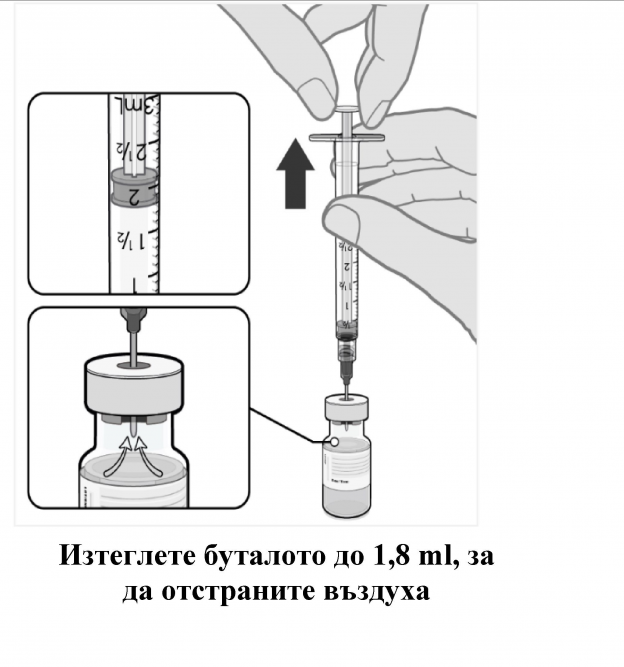 - Изравнете налягането във флакона, преди да извадите иглата от него, като изтеглите 1.8 ml въздух в изпразнената спринцовка на разредителя.