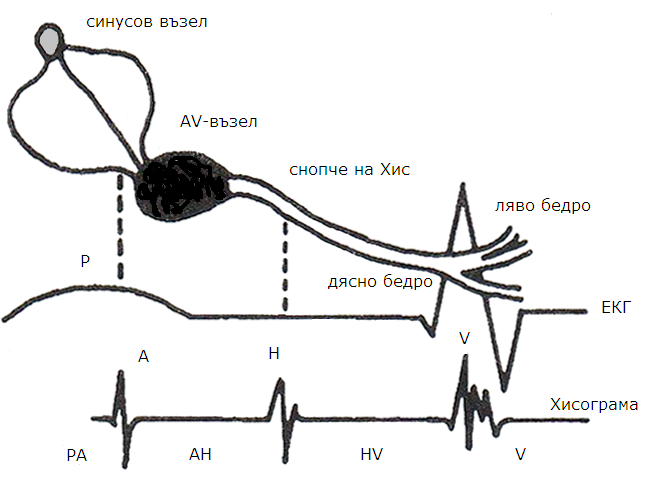 C помощта на интракардиално отведената хисограма обхванатото в PQ-интервала на конвенционалното ЕКГ глобално провеждане може да се раздели на две части - преди и след снопа на Хис.