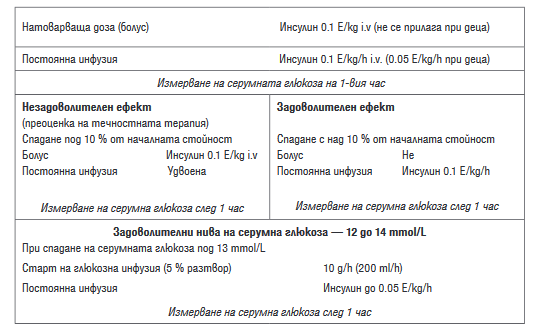 Хипергликемията се контролира по-бързо от кетоацидозата. За купиране на кетоацидозата инсулинотерапията трябва да продължи, независимо от спадането на серумните глюкозни нива. Предварителното снижение на инсулиновата доза може да предизвика задълбочаване на ацидозата. Не трябва да се допуска спадане на глюкозното серумно ниво под 13 mmol/L.