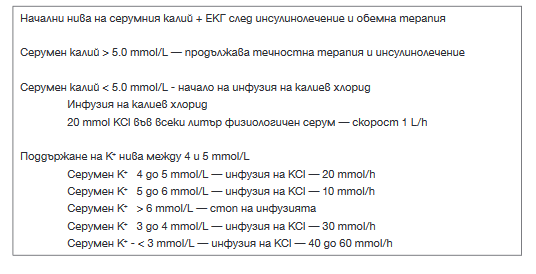 Максималните стойности на серумния калий при ДКА се достигат на 4-тия до 6-тия час след началото на симптомите. Таргетните серумни калиеви нива са между 4 и 5 mmol/L. При адекватен уринен дебит, добавката на калиев хлорид може да започне при ниво на серумен калий под 5.0 mmol/L. Приложението на калиев хлорид при ДКА е посочено на Таблица 7.