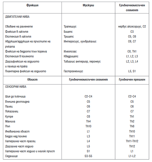 На Таблица 3 са показани двигателните и сензорни нива, които могат да улеснят топичната диагноза на ГМТ.