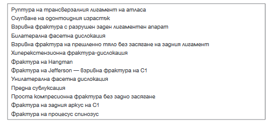 Таблица 4: Степен на остра нестабилност на увредите на шийния гръбнак (в низходящ ред)
