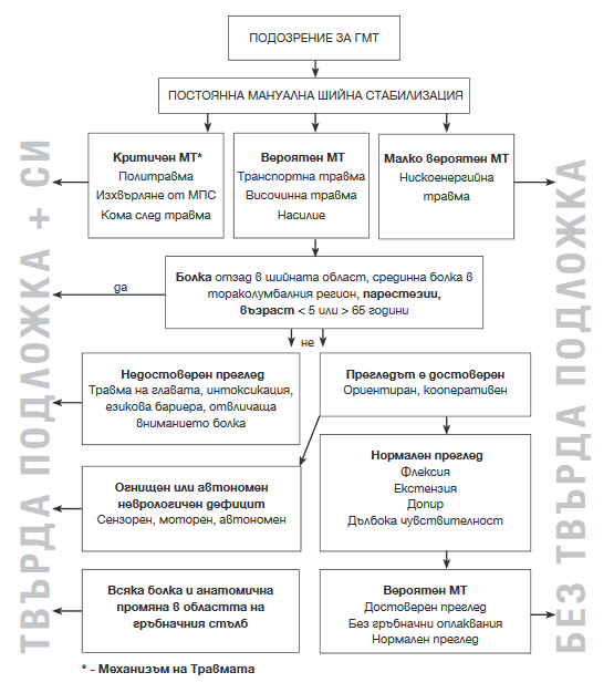 Фигура 3: Алгоритъм за подлагане на твърда подложка с пълна спинална имобилизация (СИ) при травматични пациенти