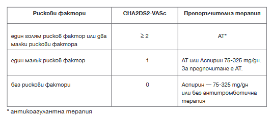 Таблица 3. Препоръки за антикоагулантно/антиагрегантно лечение в зависимост от CHA2DS2- VASc .